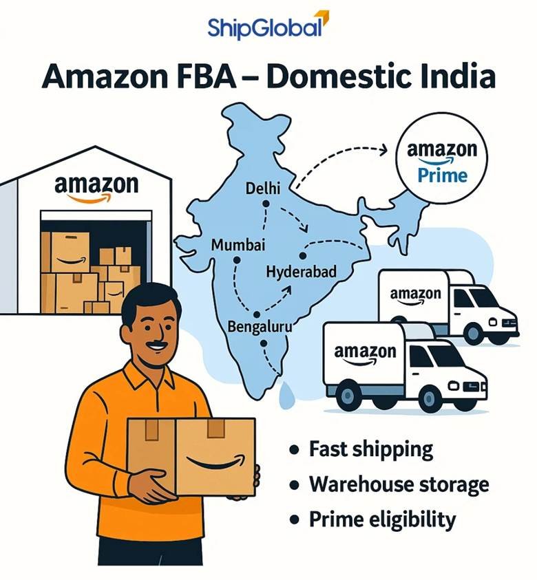 Imagine you’re a seller from Surat who sells fashion jewellery. You list your items on Amazon.in, send your stock to Amazon’s local warehouse, and when someone from Mumbai or Delhi places an order, Amazon delivers it quickly, often with Amazon Prime delivery. You don’t need to handle customer service, and your product gets the trust and visibility that comes with being “Fulfilled by Amazon.”